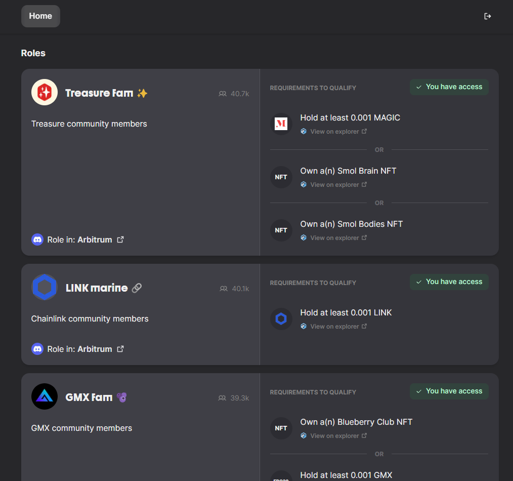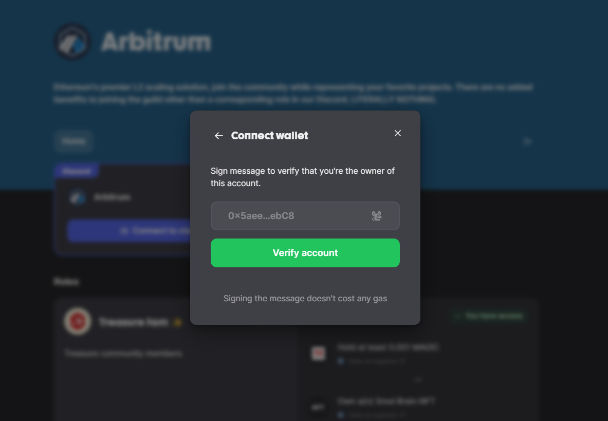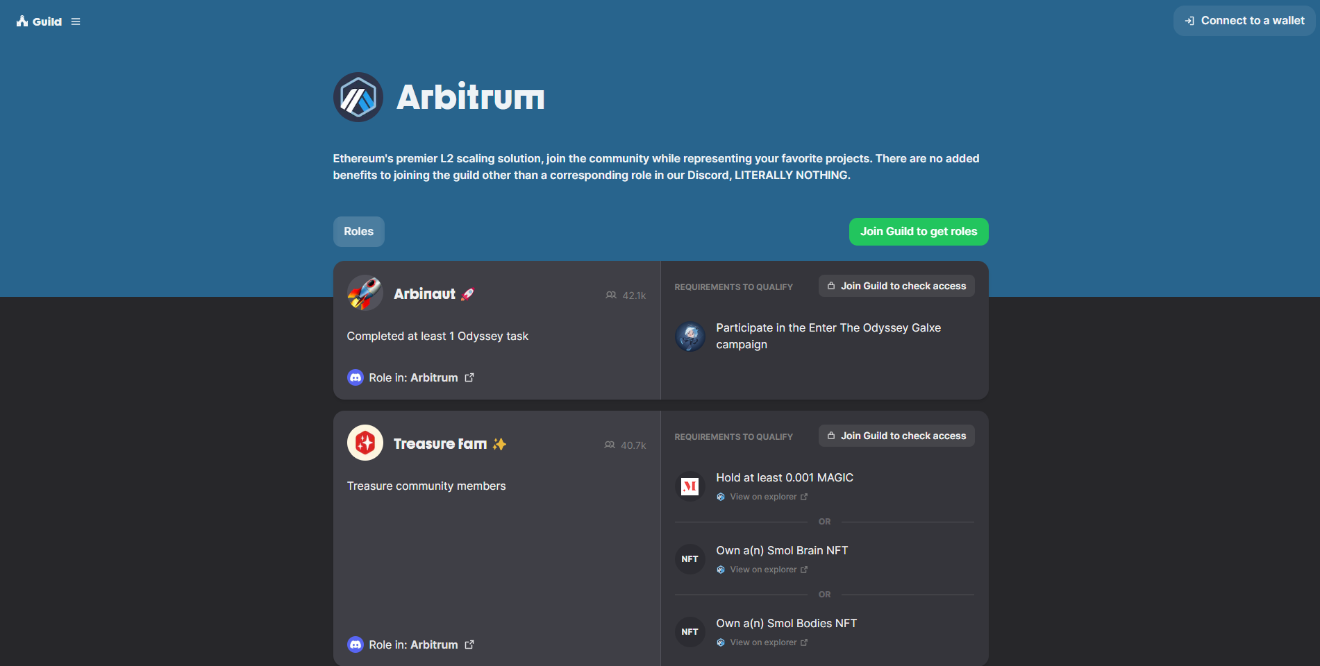 Start by going to https://guild.xyz/arbitrum, join the discord by connecting and verifying your wallet (that you set up in the previous section) from the top right corner.
