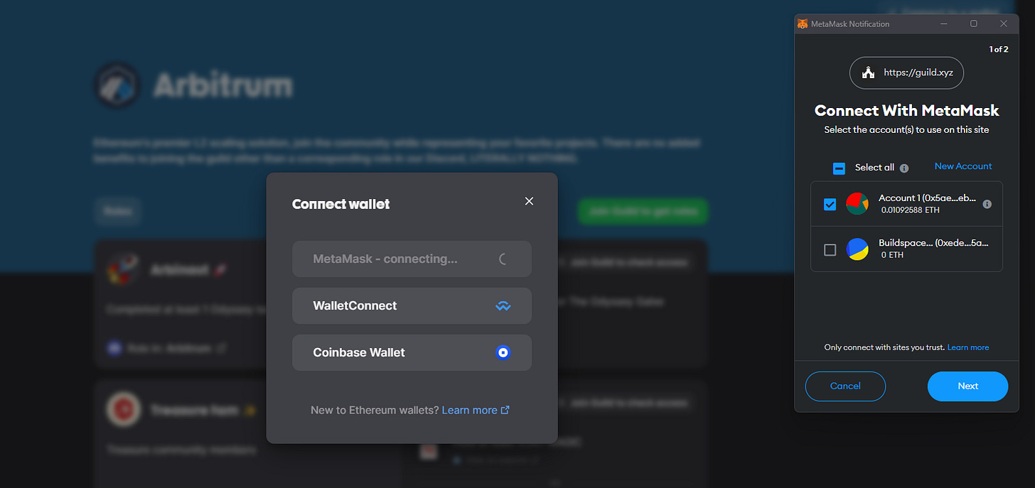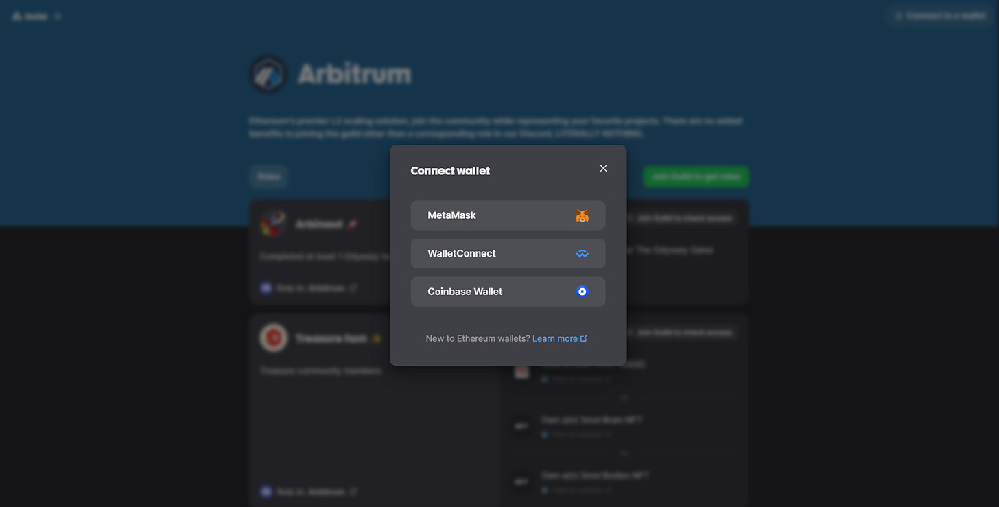 Once you land on https://guild.xyz/arbitrum, you’ll be presented a dashboard similar to the one shown above. On the top right corner, you’ll see the connect wallet button. Go ahead and click that. It should then give you a prompt that looks as follows: